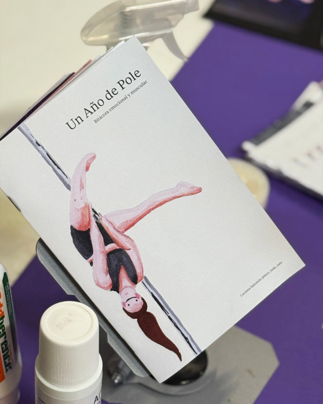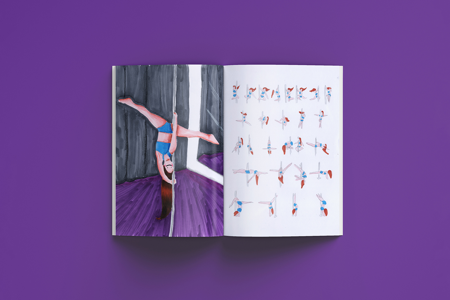 The zine captures a year of pole sport through analog illustration, handwritten notes, and the transcription of a real class — the instructor's voice, exactly as heard. It documents bruises, small victories, new friendships, and the unexpected ways a physical practice can reshape a whole year without you noticing.